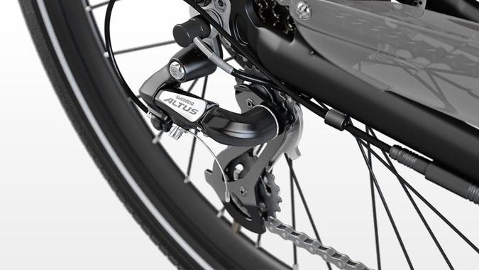 With the Shimano Altus 7 speeds derailleur you can adapt to any slope without losing sight of the road, thanks to its ergonomic handle.