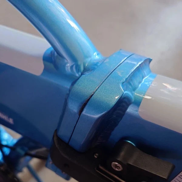 A few paint droplets visible near the frame sticker. Cosmetic finish issue.